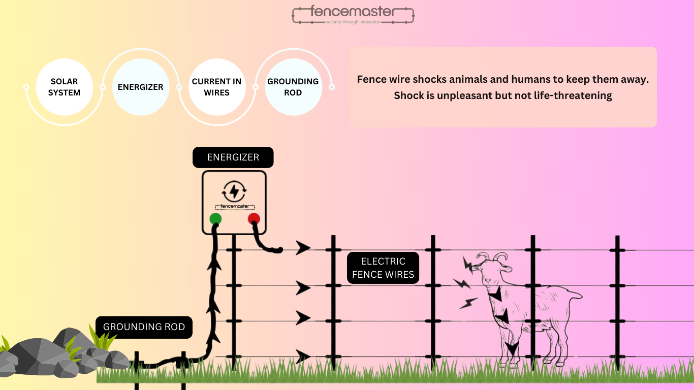 Grounding Rod : This provides a return path for the electrical current. When a human or animal touches the electrified wires, they receive a brief, harmless shock.This brief, harmless shock delivered by our electric fencing serves as a powerful blockade, creating a psychological barrier that effectively discourages humans and animals from attempting to breach the protected area again.